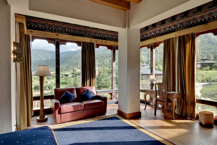 Enjoy splendid views of Paro Valley and surrounding mountains from each suite. The junior suites are spread across eight different cottages linked to the main building by an attractive pathway. Each room is fitted with either a Californian king size bed or two comfortable Californian queen beds. All bathrooms have a full-size bathtub with shower over and Swedish underfloor heating. A sitting area with leather sofas and a private balcony make these spacious rooms luxurious and private.